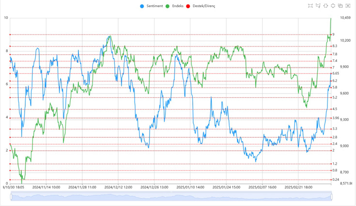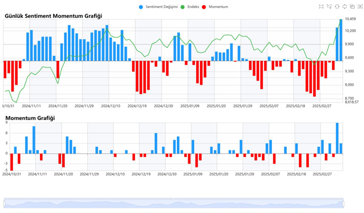 Önceki gün 4,50 seviyesine kadar çıkan Sentiment endeksi, devam eden alıcı baskısıyla 6,65 düzeyine ulaştı. Günlük Momentum ikinci günde de güçlü bir mavi bar oluşturarak alıcı ilgisinin arttığını teyit ediyor. Ayrıca Saatlik Momentum’un pozitif bölgede kalmaya devam etmesi, kısa vadede yükseliş eğiliminin korunmasına katkı sağlıyor. Bu süreçte 5,20 desteğinin korunması durumunda pozitif yönlü hareketin güçlü kalması bekleniyor.