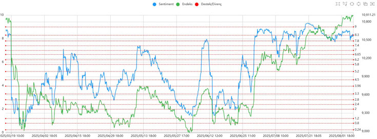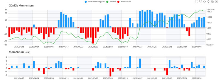 Sentiment göstergesi 7.80 – 8.30 bandında pozitif bölgede kalmaya devam etti. Günlük Momentum pozitif görünümünü korurken, saatlik Momentum da günü mavi bölgede tamamladı. Bu durum, kısa vadeli toparlanmanın sürdüğüne işaret ediyor. Genel görünümde ise iyimser hava şimdilik korunuyor.