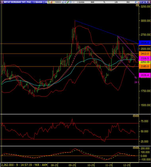 Geri çekilmelerin devamı durumunda bollinger alt bandında 2230 destek seviyesinde mevcut pozisyonlar korunabilir.