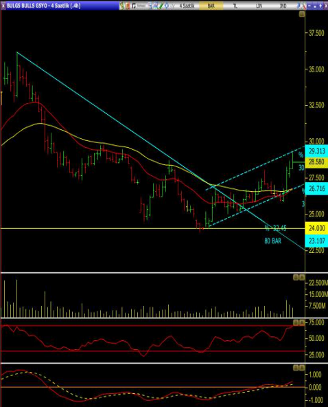 • 4 saatlik grafikte; hissenin 24.00 seviyesinden aldığı tepki ile düşen trendi aştığını görüyoruz.