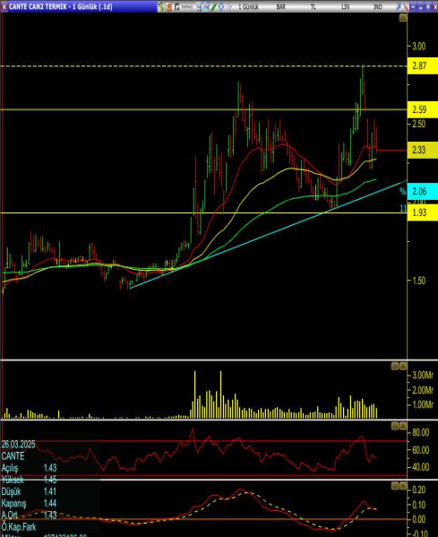 • Yukarı yönlü hareketlerde ilk direnç 2,6, ana kritik direnç ise son tepe 2,87 seviyesi. Fiyatın 2,60’ı aşması halinde yeniden 2,87’ye doğru ivmelenme potansiyeli oluşabilir; ancak 2,60 altında kalıcılık oluşması halinde satış baskısı yeniden 2,06 seviyesine doğru derinleşebilir.