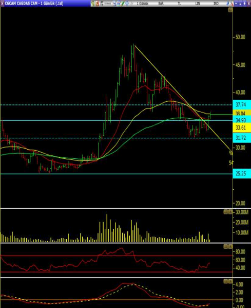 • Orta vadeli MACD de pozitif sinyale hazırlık aşamasında. Kısaca hisse düşüş trendinden çıkış sürecinin başladığını ancak 34.90 üzerindeki kalıcılığın bu dönüşü teyit etmesi gerektiğini işaret ediyor.