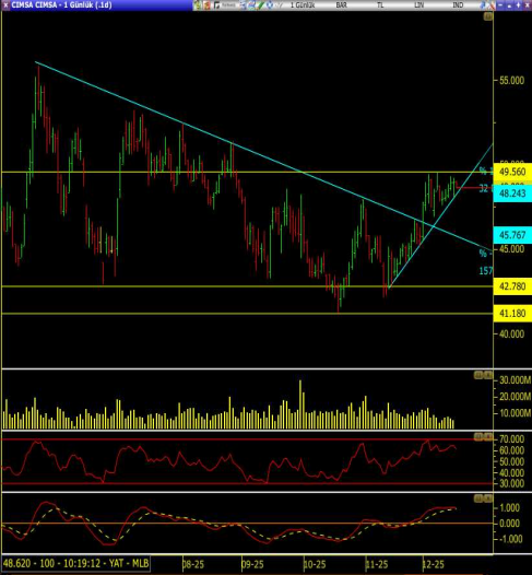 Fiyat 48,20–49,50 bandında, yani hem kırılan düşen trendin hem de önemli yükselen trendin hemen üzerinde tutunma çabasında.