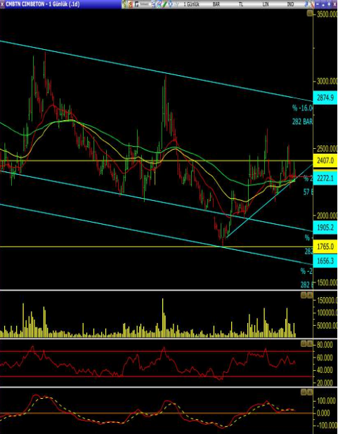 • Hacmin düşük ve MACD ’in yatay olması yukarı yönlü hareketleri sınırlıyor. 2200 seviyesi ilk destek olabilirken fiyatın bu destek altına düşmesi halinde ise uzun vadeli düşüş trendi tekrar aktif olur.