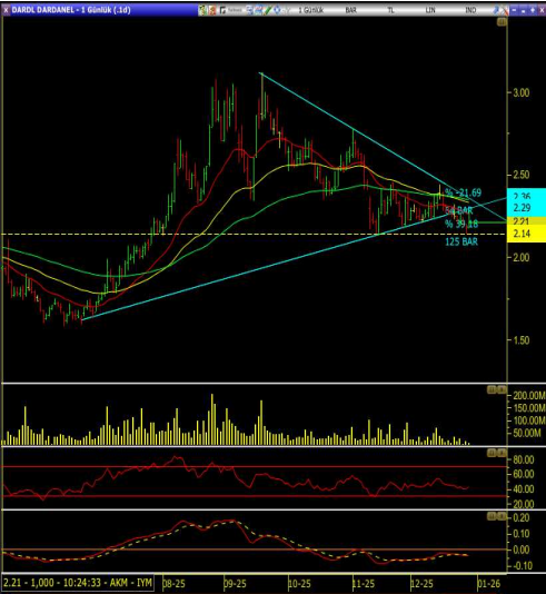 Yukarı yönde 2,29 güçlü direnç seviyesi. Bu alan aşılmadan düşüş trendi bozulmuş sayılmaz. 2,21 altında kaldıkça teknik görünüm negatiftir, olası yükselişler tepki niteliğinde kalır, kalıcı toparlanma için fiyatın üçgen içine dönmesi, 2,29 üzeri günlük kapanış yapması gerekir.