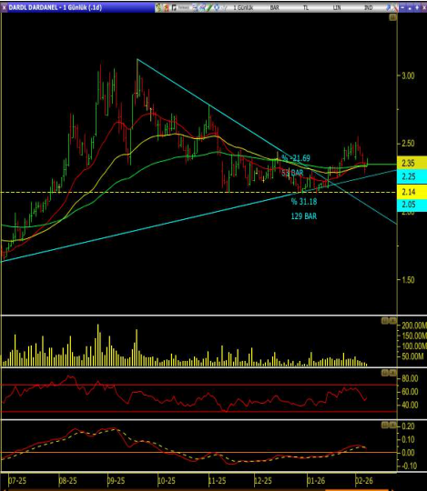 Fiyat, kısa ve orta vadeli ortalamalar üzerine atmış, 2.25 – 2.35 bandında tutunuyor, RSI 50 üstüne geçip momentumu toparlamış, hacimde dipten itibaren kademeli artış var, bu zayıf görünümden toparlanmaya geçiş sinyali veriyor;