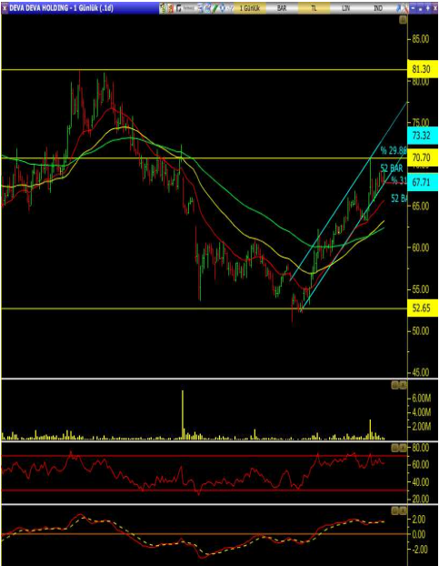 • Hisse, 52.65 seviyesinden aldığı destek ile yükselerek 70.70 seviyesini test ediyor.