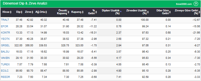 Hisselerin en düşük fiyatlarını, en yüksek fiyatlarını, ağırlıklı ortalama ve kapanış fiyatlarını, dipten ve zirveden uzaklıklarını görebilirsiniz. Hisselerin dip ve zirve seviyelerini takip ederek fiyatlarının dip ve zirve seviyelerine göre ne kadar iskontolu yada primli olduğunu görebilirsiniz.