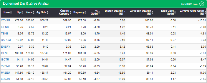 Hisselerin en düşük fiyatlarını, en yüksek fiyatlarını, ağırlıklı ortalama ve kapanış fiyatlarını, dipten ve zirveden uzaklıklarını görebilirsiniz. Hisselerin dip ve zirve seviyelerini takip ederek fiyatlarının dip ve zirve seviyelerine göre ne kadar iskontolu yada primli olduğunu görebilirsiniz.