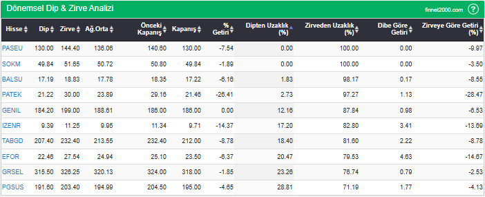 Hisselerin en düşük fiyatlarını, en yüksek fiyatlarını, ağırlıklı ortalama ve kapanış fiyatlarını, dipten ve zirveden uzaklıklarını görebilirsiniz. Hisselerin dip ve zirve seviyelerini takip ederek fiyatlarının dip ve zirve seviyelerine göre ne kadar iskontolu yada primli olduğunu görebilirsiniz.