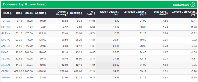 Hisselerin en düşük fiyatlarını, en yüksek fiyatlarını, ağırlıklı ortalama ve kapanış fiyatlarını, dipten ve zirveden uzaklıklarını görebilirsiniz. Hisselerin dip ve zirve seviyelerini takip ederek fiyatlarının dip ve zirve seviyelerine göre ne kadar iskontolu yada primli olduğunu görebilirsiniz.