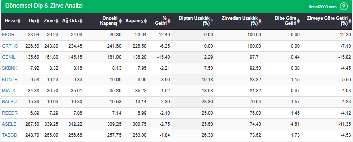 Hisselerin en düşük fiyatlarını, en yüksek fiyatlarını, ağırlıklı ortalama ve kapanış fiyatlarını, dipten ve zirveden uzaklıklarını görebilirsiniz. Hisselerin dip ve zirve seviyelerini takip ederek fiyatlarının dip ve zirve seviyelerine göre ne kadar iskontolu yada primli olduğunu görebilirsiniz.