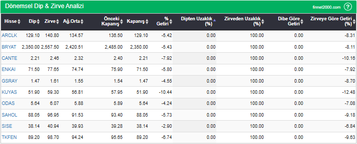 Hisselerin en düşük fiyatlarını, en yüksek fiyatlarını, ağırlıklı ortalama ve kapanış fiyatlarını, dipten ve zirveden uzaklıklarını görebilirsiniz. Hisselerin dip ve zirve seviyelerini takip ederek fiyatlarının dip ve zirve seviyelerine göre ne kadar iskontolu yada primli olduğunu görebilirsiniz.
