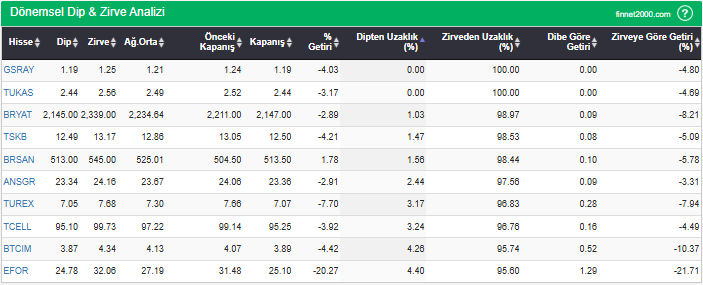 Hisselerin en düşük fiyatlarını, en yüksek fiyatlarını, ağırlıklı ortalama ve kapanış fiyatlarını, dipten ve zirveden uzaklıklarını görebilirsiniz. Hisselerin dip ve zirve seviyelerini takip ederek fiyatlarının dip ve zirve seviyelerine göre ne kadar iskontolu yada primli olduğunu görebilirsiniz.