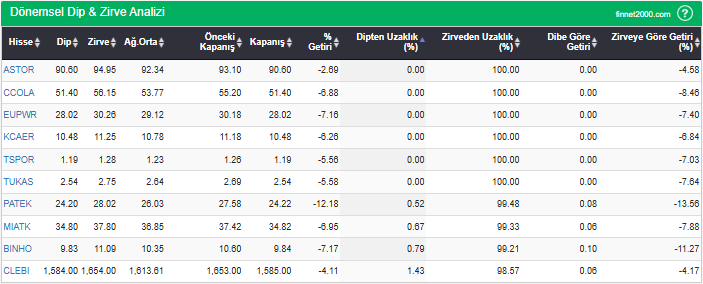 Hisselerin en düşük fiyatlarını, en yüksek fiyatlarını, ağırlıklı ortalama ve kapanış fiyatlarını, dipten ve zirveden uzaklıklarını görebilirsiniz. Hisselerin dip ve zirve seviyelerini takip ederek fiyatlarının dip ve zirve seviyelerine göre ne kadar iskontolu yada primli olduğunu görebilirsiniz.