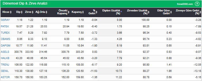 Hisselerin en düşük fiyatlarını, en yüksek fiyatlarını, ağırlıklı ortalama ve kapanış fiyatlarını, dipten ve zirveden uzaklıklarını görebilirsiniz. Hisselerin dip ve zirve seviyelerini takip ederek fiyatlarının dip ve zirve seviyelerine göre ne kadar iskontolu yada primli olduğunu görebilirsiniz.
