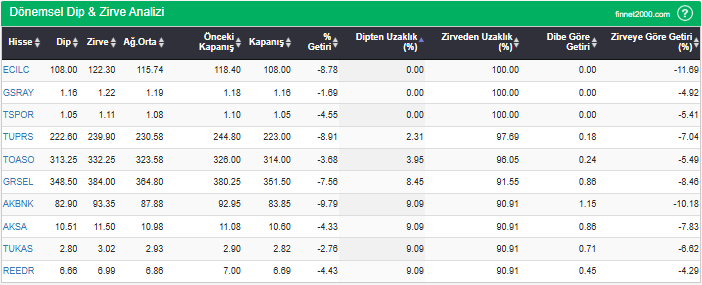 Hisselerin en düşük fiyatlarını, en yüksek fiyatlarını, ağırlıklı ortalama ve kapanış fiyatlarını, dipten ve zirveden uzaklıklarını görebilirsiniz. Hisselerin dip ve zirve seviyelerini takip ederek fiyatlarının dip ve zirve seviyelerine göre ne kadar iskontolu yada primli olduğunu görebilirsiniz.