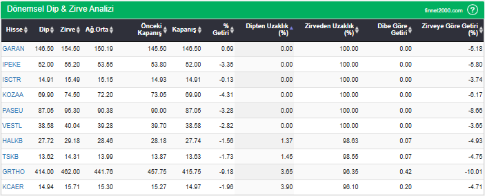 Hisselerin en düşük fiyatlarını, en yüksek fiyatlarını, ağırlıklı ortalama ve kapanış fiyatlarını, dipten ve zirveden uzaklıklarını görebilirsiniz. Hisselerin dip ve zirve seviyelerini takip ederek fiyatlarının dip ve zirve seviyelerine göre ne kadar iskontolu yada primli olduğunu