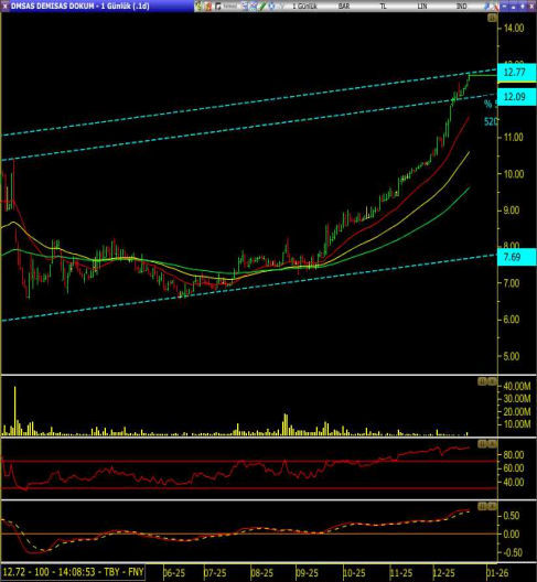 Fiyat yaklaşık 12,70 – 12,80 bandında, kanal üst bandına yaklaşılmış durumda, kısa vadede bu bölge kar realizasyonlarının gelebileceği bir alan. 13,00 – 13,50 bandı ilk güçlü direnç, kanal üstü kalıcı kırılırsa 14,00 psikolojik seviyesi gündeme gelebilir.