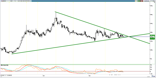 DOAS hissesinde oldukça net bir sıkışma görülüyor. Özellikle de simetrik üçgenin sınırlarına dayanacak ölçüde şiddetli bir sıkışma… Bu fiyatlama sıkışmanın sonuna gelindiğinin habercisi olabilir. Dikkatle izlenmeli. Yalnız bu sıkışma hareketleri ana yönü göstermez. Yani yukarı mı yoksa aşağı mı kırılım olacağını söylemez. Söylediği şey şudur; Kırılımın olacağı yöne doğru sert hareketlerin yaşanabileceği… Bu nedenle sıkışma aralığı olan 185.30 – 170.00 bölgesinin hangi yöne kırılacağını takip edeceğiz. Olası senaryolara bakalım;