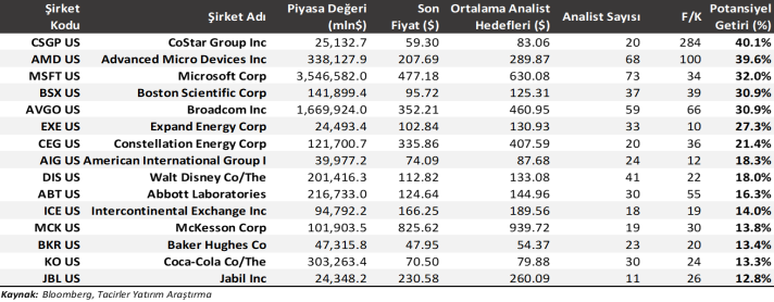 Güncel değerleme / analiz raporları yayımlanan ve bu raporlarda ‘’alım’’ önerileri ile dikkat çeken S&P 500 şirketlerini aşağıda görebilirsiniz. Tablodaki veriler, Tacirler Yatırım beklentilerini değil, Bloomberg’de paylaşılan güncel analist beklentilerini yansıtmaktadır.