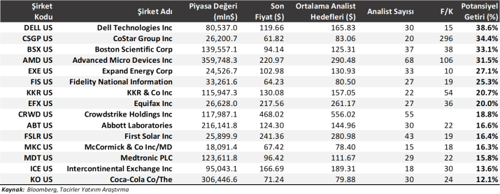 Güncel değerleme / analiz raporları yayımlanan ve bu raporlarda ‘’alım’’ önerileri ile dikkat çeken S&P 500 şirketlerini aşağıda görebilirsiniz. Tablodaki veriler, Tacirler Yatırım beklentilerini değil, Bloomberg’de paylaşılan güncel analist beklentilerini yansıtmaktadır.