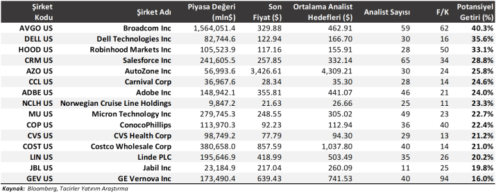 Güncel değerleme / analiz raporları yayımlanan ve bu raporlarda ‘’alım’’ önerileri ile dikkat çeken S&P 500 şirketlerini aşağıda görebilirsiniz. Tablodaki veriler, Tacirler Yatırım beklentilerini değil, Bloomberg’de paylaşılan güncel analist beklentilerini yansıtmaktadır.