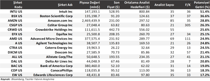 Güncel değerleme / analiz raporları yayımlanan ve bu raporlarda ‘’alım’’ önerileri ile dikkat çeken S&P 500 şirketlerini aşağıda görebilirsiniz. Tablodaki veriler, Tacirler Yatırım beklentilerini değil, Bloomberg’de paylaşılan güncel analist beklentilerini yansıtmaktadır.