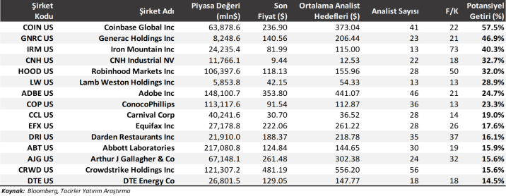 Güncel değerleme / analiz raporları yayımlanan ve bu raporlarda ‘’alım’’ önerileri ile dikkat çeken S&P 500 şirketlerini aşağıda görebilirsiniz. Tablodaki veriler, Tacirler Yatırım beklentilerini değil, Bloomberg’de paylaşılan güncel analist beklentilerini yansıtmaktadır.