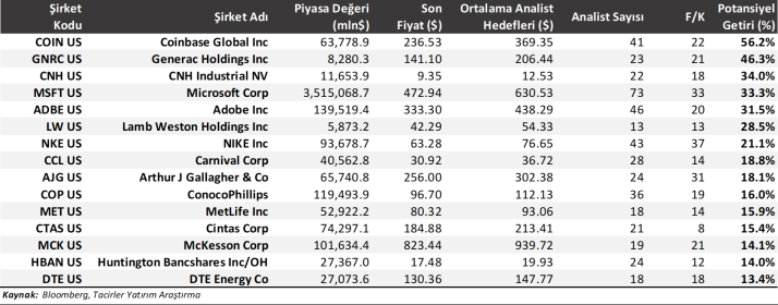 Güncel değerleme / analiz raporları yayımlanan ve bu raporlarda ‘’alım’’ önerileri ile dikkat çeken S&P 500 şirketlerini aşağıda görebilirsiniz. Tablodaki veriler, Tacirler Yatırım beklentilerini değil, Bloomberg’de paylaşılan güncel analist beklentilerini yansıtmaktadır.