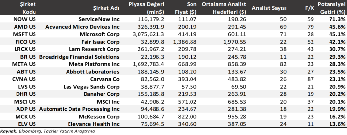 Güncel değerleme / analiz raporları yayımlanan ve bu raporlarda ‘’alım’’ önerileri ile dikkat çeken S&P 500 şirketlerini aşağıda görebilirsiniz. Tablodaki veriler, Tacirler Yatırım beklentilerini değil, Bloomberg’de paylaşılan güncel analist beklentilerini yansıtmaktadır.