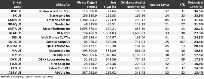 Güncel değerleme / analiz raporları yayımlanan ve bu raporlarda ‘’alım’’ önerileri ile dikkat çeken S&P 500 şirketlerini aşağıda görebilirsiniz. Tablodaki veriler, Tacirler Yatırım beklentilerini değil, Bloomberg’de paylaşılan güncel analist beklentilerini yansıtmaktadır.