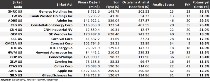 Güncel değerleme / analiz raporları yayımlanan ve bu raporlarda ‘’alım’’ önerileri ile dikkat çeken S&P 500 şirketlerini aşağıda görebilirsiniz. Tablodaki veriler, Tacirler Yatırım beklentilerini değil, Bloomberg’de paylaşılan güncel analist beklentilerini yansıtmaktadır.