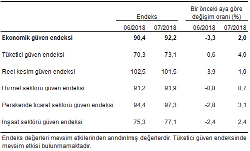Ekonomik güven endeksi Temmuz ayında bir önceki aya göre %2 oranında artarak 90,4 değerinden 92,2 değerine yükseldi. Ekonomik güven endeksindeki yükseliş, tüketici, perakende ticaret, inşaat ve hizmet sektörü güven endekslerindeki artışlardan kaynaklandı.