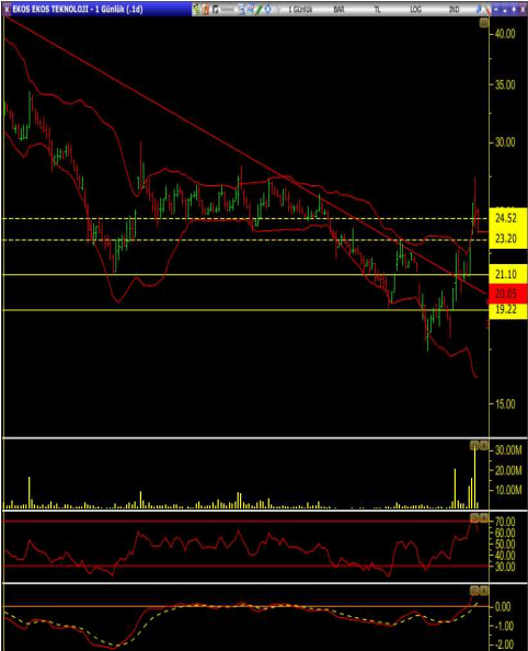 • 22 ve 50 günlük ortalamasının üzerinde fiyatlanan hisse, bolinger üst bandı üzerinden geri çekiliyor, dolayısıyla kar satışlarının gelme ihtimalini düşündürüyor.