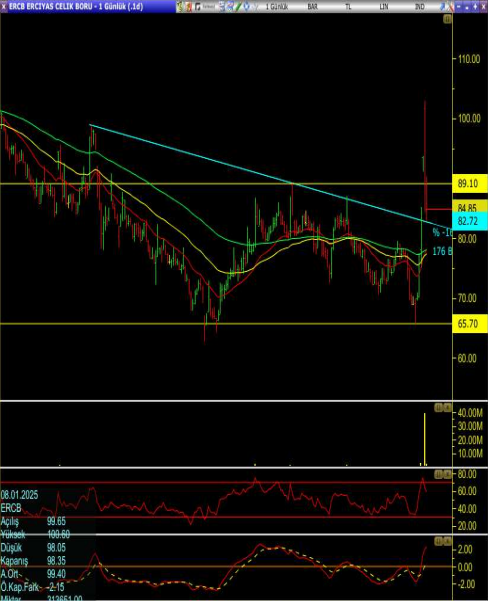 • Fiyat uzun süre baskılayan alçalan trend çizgisini güçlü hacim eşliğinde yukarı kırmış, ardından 100 seviyesine doğru ani yükseldi; fakat bu bölgeden yine aynı sertlikle geri çekilerek 82–84 bandına kadar gerilemiş durumda.