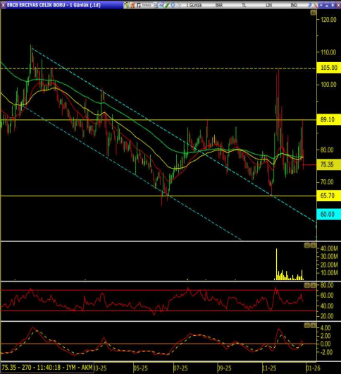Hisse uzun süredir aşağı yönlü bir kanal içinde hareket etmiş ve bu kanalın alt bandına doğru sarkmalar sonrası 65,70 seviyesinden güçlü bir tepki alımı gelmiş.