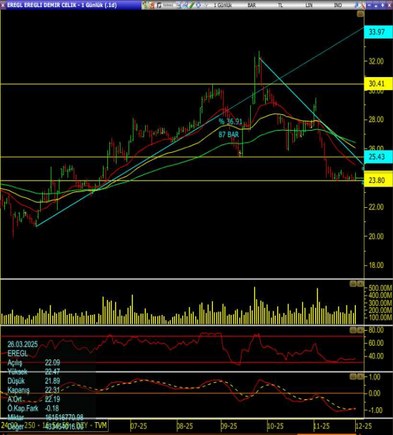Genel olarak 23.80 bölgesi kritik savunma hattı konumunda. Ancak fiyatın bu bölgede taban oluşturup hacim destekli bir yukarı dönüş göstermesi 25.42 takip edilir.