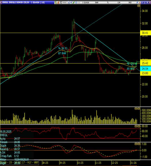 Hissede orta–uzun vadede net bir zayıflama sürecinin ardından yatay dengelenme çabası görülüyor; 32–34 bandından başlayan ana düşüş trendinin son bulduğunu, 25.42 kritik direncinin aşıldığını görüyoruz.