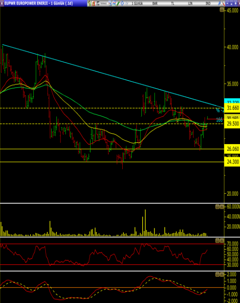• Hisse hala düşen trend baskısı altında fakat toparlanma çabası içinde. Bu anlamda ise 31.66 seviyesi ilk önemli direnç olarak takip edilebilir. 31.66 üzerinde kapanışın gerçekleşmesi halinde yukarı yönlü hareket hız kazanır. 29.50 seviyesi ise olası geri çekilme hareketlerine karşı ilk destek olarak izlenebilir.