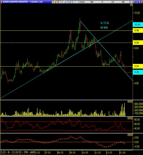 Son düşüşle birlikte 5,91 seviyesi kritik bir destek olarak çalışmış, bu bölgenin de kırılması ile satış baskısı etkisini göstermiş durumda.