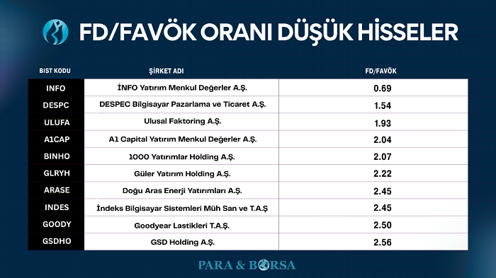 Aşağıdaki tablo, güncel verilere göre fd/favök oranı en iyi hisseler arasında yer alan şirketleri göstermektedir: