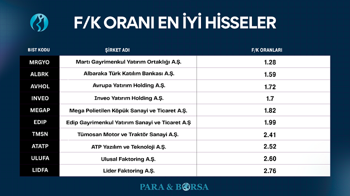 Aşağıdaki tablo, güncel verilere göre f/k oranı en iyi hisseler arasında yer alan şirketleri göstermektedir: