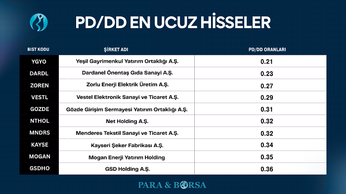Aşağıdaki tablo, güncel verilere göre pd/dd en ucuz hisseler arasında yer alan şirketleri göstermektedir: