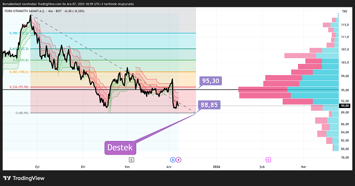 FROTO hissesi için grafikte sunulan teknik göstergeler ve finansal veriler arasında derin bir analiz yapıldığında, birbirleriyle çelişen ancak anlamlı sinyaller ortaya çıkıyor. Hisse Ağustos ayında 118,30 ile yılın en yüksek seviyesini gördükten sonra 89,70’e kadar gerileyen bir düşüş trendi yaşadı. Mevcut 90,80 TL fiyatı, 88,85 TL’lik kritik destek seviyesinin hemen üzerinde bulunuyor ve bu bölge güçlü bir taban oluşturma potansiyeline işaret ediyor.