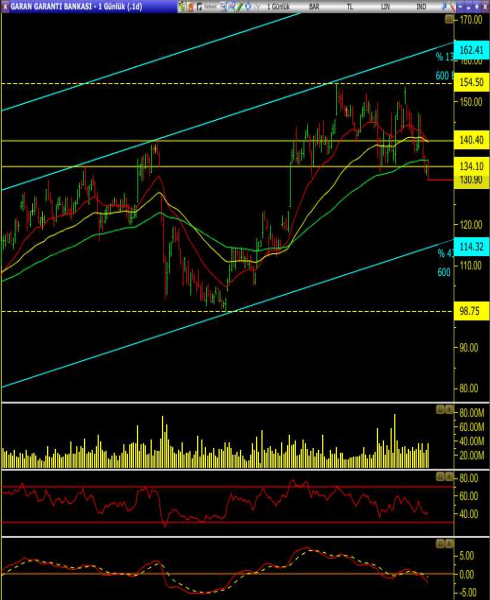 • Hisse uzun vadeli yükselen kanal içinde hareket ediyor. Ancak kısa, orta, uzun vadeli ortalamaların aşağı yönlü hizalanmış olduğunu görüyoruz.