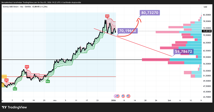 Grafikte dikkat çeken en önemli unsur, kırmızı okla işaretlenmiş olan 80,73 seviyesinden 59,78 seviyesine doğru çizilen düşüş projeksiyonu. Bu hareket, piyasada ciddi bir kar realizasyonu ve potansiyel olarak Fed’in para politikası beklentileri veya güvenli liman talebindeki değişikliklerle ilişkili olabilir. Çin de gümüşü devlet ihracatında hassasiyet listesine aldı.