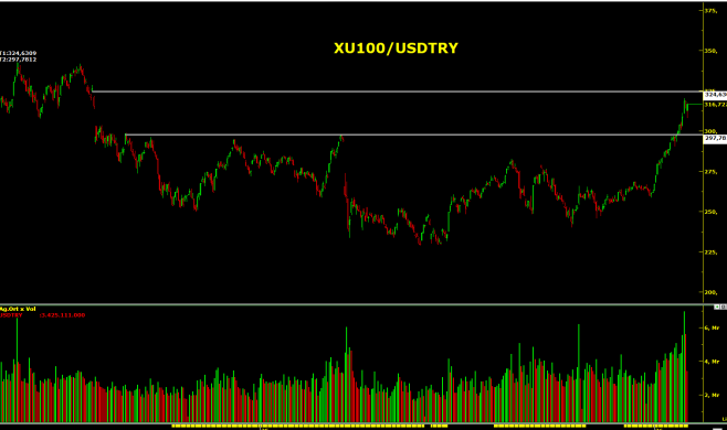 Kısa vadeli düzeltmelerle gelen geri çekilmeler, orta vadeli yukarı trend yapısını şu an için bozulmuş durumda değil ancak emtialardaki sert dalgalanmalar bitene kadar yine de temkinli olmakta fayda var. TÜFE verileri ile birlikte endeksteki resim daha net okunacaktır. Sabah notlarımızda belirttiğimiz ilk destek seviyesi olan 308 seviyesinden gelen tepki ile endeks yeniden 314 dolar seviyesine kadar yükselen endekste teminat tamamlama çağrısı saatlerine doğru yükselişler mevcut. 314-318 bandında endekste yükselişi destekleyecek bölge olarak takip edilebilir