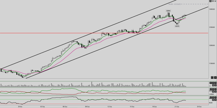 Bist 100 endeksi saatlik grafikte yükselen kanal içerisine yerleşmeyi deniyor. İndikatörlerin soğumasıyla birlikte güç toplayan endekste, 12.575 seviyelerinden gelen alış tepkisi fiyatı tekrar Ema 8 ve Ema 21 ortalamalarının üzerine taşıdı.