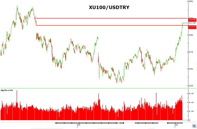 BIST100 dolar bazlı 300 seviyesinden gelen güçlü alışlarla 314 direncini de kırarak 317 seviyesinde işlem görmekte. Endekste dolar bazlı yeni bant aralığı 314–323 bandı. Gerek makro veriler gerekse yabancı ilgisinin başlangıcı, endekste teknik yükselişleri destekleyen ana unsurlar arasında.